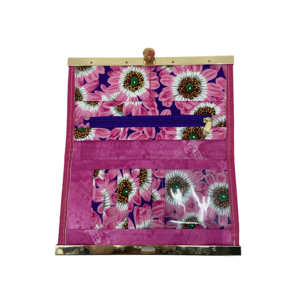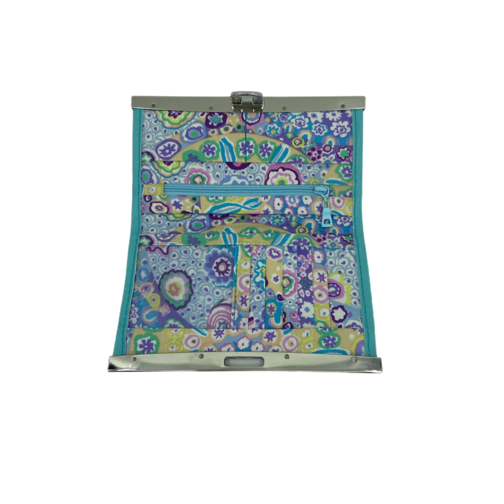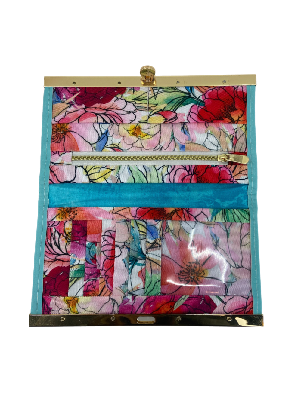 The Interior features 5 credit card slots with a clear ID pocket as well as 2 more pockets on the opposite side for additional cards. The zippered coin pocket will hold lots of loose change or an item you may wish to secure. There are 2 billfold pockets; one under the credit card section and one under the zippered pocket. This wallet opens flat so you can fully access your cash and is a great grab and go item!